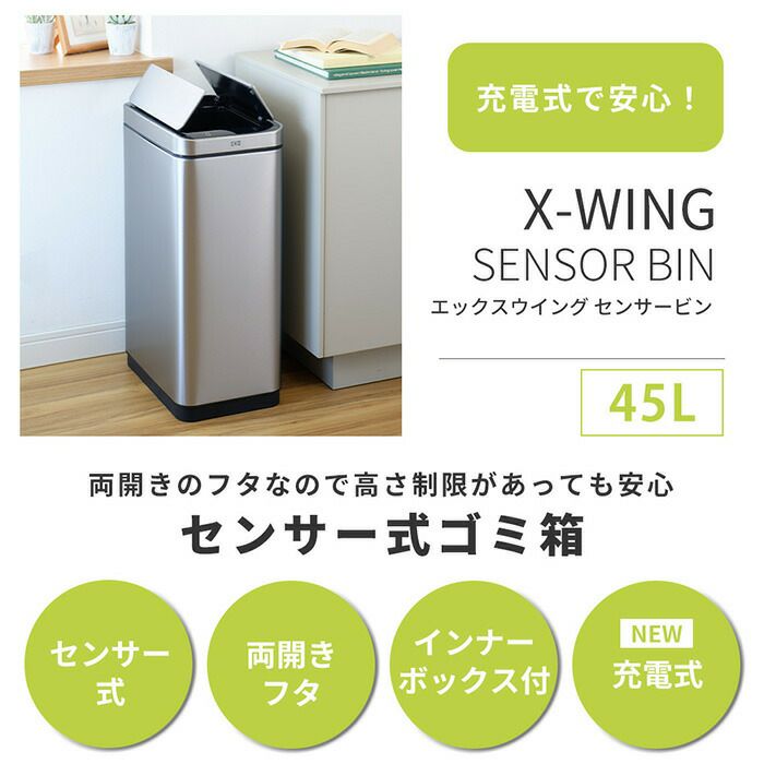 自動開閉ゴミ箱 45L センサー付き エックスウィングセンサービン 両開き 充電式 EKO