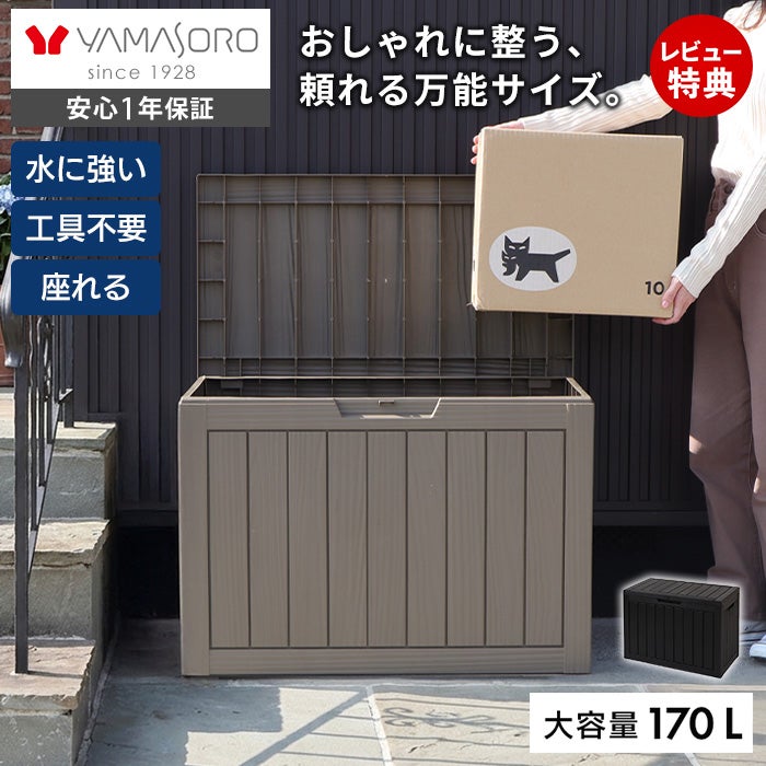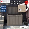 屋外でも屋内でも使用可能な樹脂製の大容量ストレージベンチボックス。樹脂製のため、屋外に設置しても錆びの心配がありません。浸水しにくい構造で水洗いもできるので、お手入れも簡単です。大きめの荷物も受け取れる、ベランダ収納などに最適な170Lサイズは、45Lのゴミ袋が約3.8個分も収納できます。ゴミの一時置きができるゴミストッカーとして使用したり、ガーデニング用品やお子さまの遊び道具などの収納に使用したり、灯油や災害用グッズの保管に使用したりと様々なシーンで活躍します。直径約6.5mmまでの南京錠が取り付けられる鍵穴付きで防犯面も安心のため、宅配ボックスとしてもご使用いただけます。椅子としても活躍する高耐久設計。大人も座れ、アウトドアや玄関先の腰掛にもなります。さらに、本体重量約4.7kgと女性でも持ち運びやすい軽量設計。持ち手も付いており、簡単に移動できます。丈夫な作りながら、工具不要で板をはめ込むだけの簡単組み立て。分かりやすい電子説明書を段ボールのQRコードからご確認いただけます。本物の木材のような、表面の凹凸感までこだわった繊細な木目柄のお洒落なデザインで、外観やインテリアの雰囲気を損ないません。手軽でオシャレな、屋外でも使用できる収納をお探しの方におすすめです。