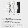 | 花粉、カビ、ホコリなど0.1μm以上の有害物質をハイスピードで除去するHEPAフィルター。吸引から清浄までの間に、機能が異なる高性能フィルターで段階的に空気をろ過します。フィルターの物質捕獲サイズは約0.09μm。粒子径が2.5μm以下であるPM2.5は、当然フィルターを通過できず、捕獲できます。更に、ニオイや菌を吸着する活性炭と、それらをLED光で分解・除去する光触媒技術を用いた「セルフクリーニング機能」を搭載しました。このサイクルによってフィルターが自己再生し、長寿命化を実現しています。 |