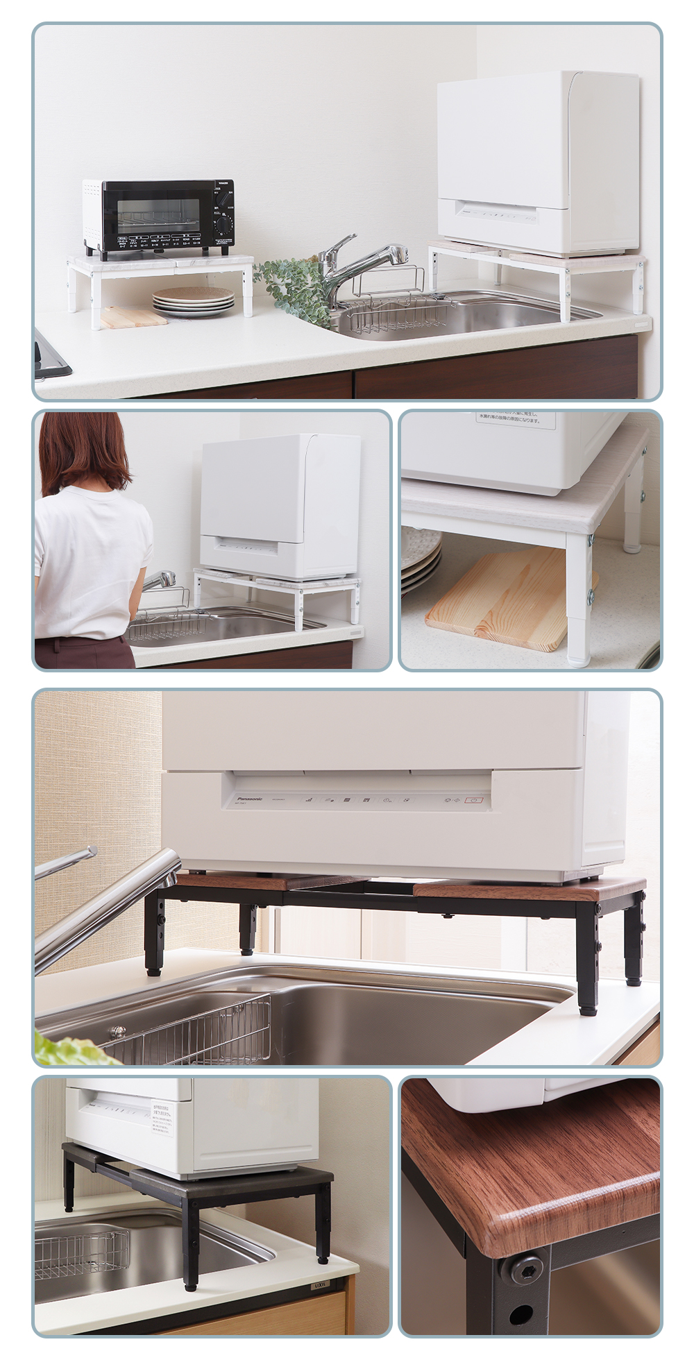 天板を広げると(約)幅55×奥行29cmの食洗器も設置可能。最小の幅でもトースターやケトルなどを設置することができます。
